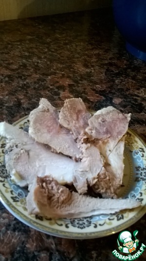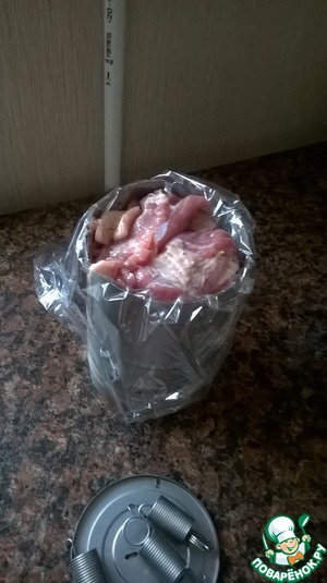На следующий день замаринованное мясо поместить в пакет для запекания, который помещаем в ветчинницу и начинаем выкладывать слоями мясо: слой куриного филе, слой свинины.