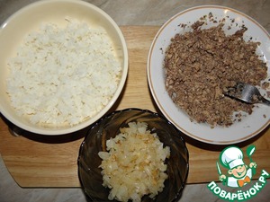 Лук обжарить, рис отварить, рыбу хорошо размять вилкой, без жидкости ( я совсем каплю добавляю, чтоб легче мять было..)