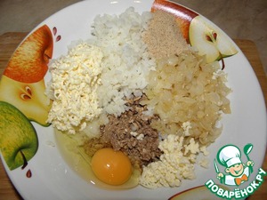 К рыбе добавить отварной рис, обжаренный лук, натертый на терке сырок, вбить яйцо, и добавить 1 ст. л сухарей, добавить специи ( с солью осторожно) и все хорошо перемешать.., дать постоять минут 5-7.