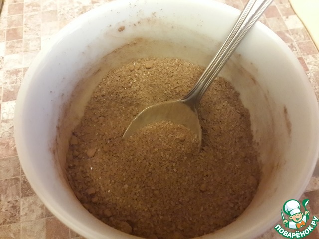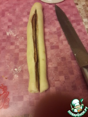 От теста отщипываем кусочек величиной примерно с кулак, раскатываем тонко, посыпаем какао с сахаром, скручиваем рулетом