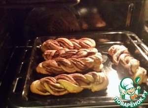 Укладываем на противень, ставим в холодную духовку, включаем её на 50 градусов на 15 минут - за это время витки приподнимутся слегка (вообще они сильно не поднимаются), затем переключаем на 150 градусов и допекаем до румяного цвета.