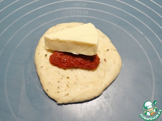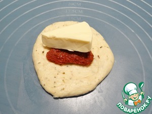Каждый шар теста чуть раскатываю, на середину кладу половинку вяленого томата и треугольник плавленого сыра.