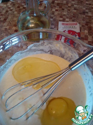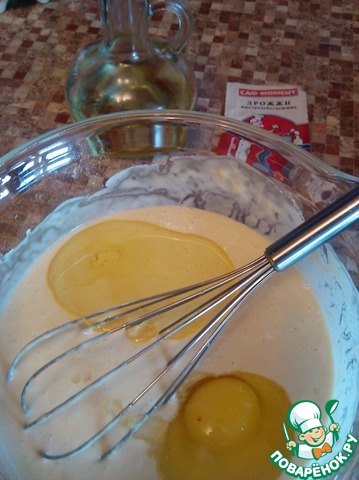 В остальную муку добавить соль и сахар, яйцо и масло, влить разведенные дрожжи