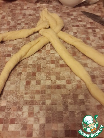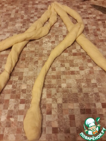 Итак, делим тесто на 2 части. Каждую часть делим на 4 жгута.