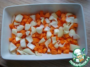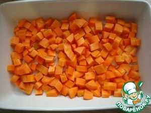 Нарезаем морковь средним кубиком и кладем в форму для запекания.