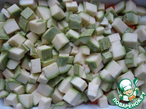 Нарезаем кабачок средним кубиком, и чеснок.