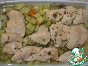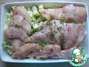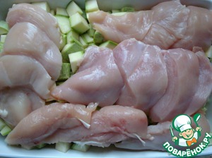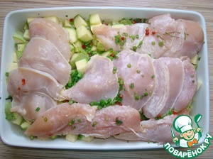 Сверху выкладываем куриную грудку, нарезанную порционными кусками.