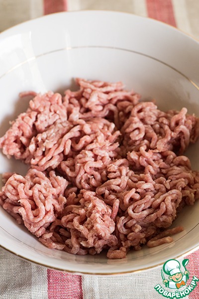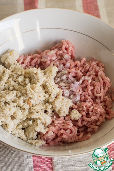 • Лук почистить и мелко нарезать. В миске смешать фарш, хлеб с молоком и нарезанный лук.