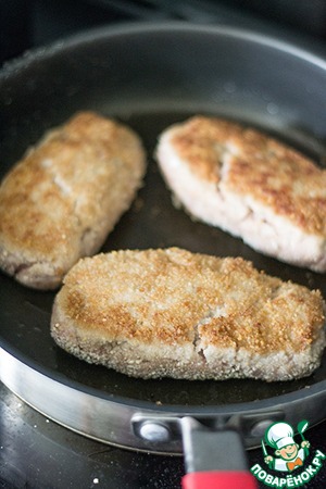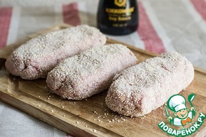• Полученный фарш поделить на 3 части. Скатать мясные батоны. Обвалять в панировочных сухарях со всех сторон.