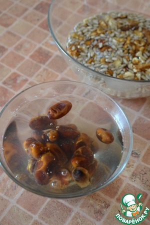 Орехи и семечки залить холодной кипячёной водой и оставить на 2 часа. Финики залить кипятком.