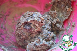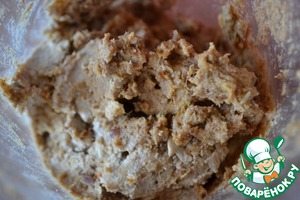Воду с фиников и орехов с семечками слить. Измельчить освобождённые от косточек финики, грецкие орехи и семечки до состояния пасты.