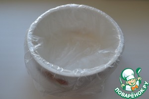 Форму застелить пищевой плёнкой или полиэтиленом.