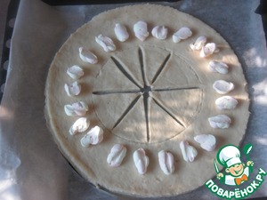 • Полученный круг смазать взбитым яйцом и выпекать в разогретой духовке минут 20 (духовка примерно 180градусов)