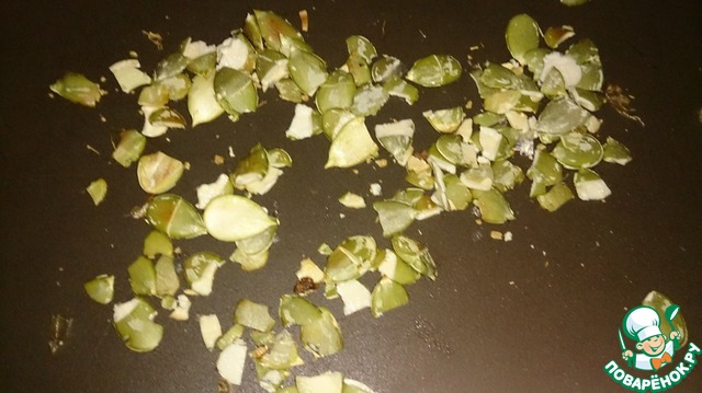 Семена тыквы обжарить на сухой сковороде, а затем измельчить ножом.