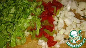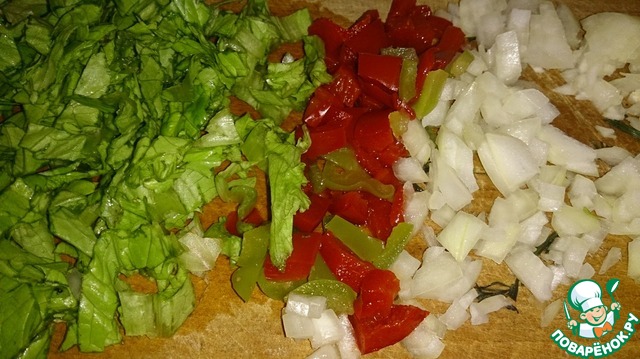 Болгарский перец, лук и листья салата -помыть, очистить. Нарезать мелко, и обжарить на оливковом масле.
