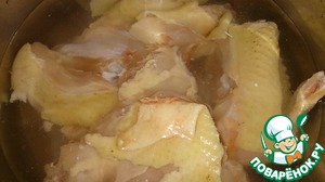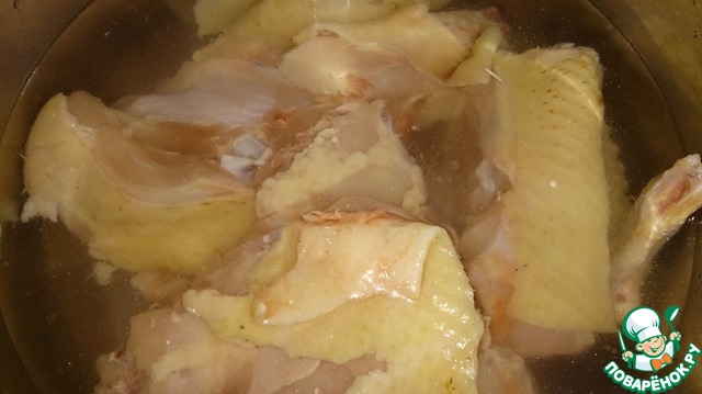 Курицу разделать, почистить подготовить для варки. Выложить кусочки мяса в кастрюлю и варить до готовности. Важно не переварить курицу! Лучше всего, чтобы мясо оставалось немного жестким. Бульон после варки не выливать, отложить в сторону.