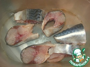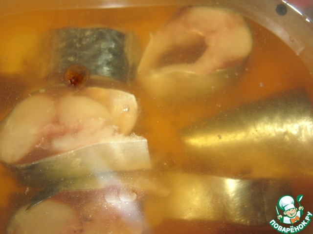 Сложить кусочки скумбрии в судок и залить охлаждённым маринадом,