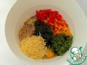 К фаршу добавить болгарский перец, чеснок и лук (пропущенные через блендер или мясорубку), петрушку и укроп (мелко нарезанные), сыр (натертый на средней или мелкой терке), панировочные сухари и яйцо. Хорошо перемешать.