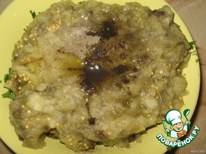Когда баклажаны станут мягкими, остужаем их, а потом вынимаем из них мякоть. Мякоть можно просто размять вилкой или порубить ножом прямо в тарелке.