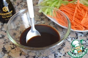 2. Овощи нарезать тонкой соломкой, чеснок и имбирь очистить и мелко порубить.