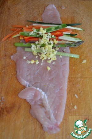 4. Выложить овощи на отбитый пласт индейки, посыпать рубленным чесноком и имбирем и туго свернуть.