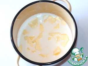 Кефир, мягкое масло (или тертое на крупной терке), сахар и соль смешать и слегка подогреть до 50 градусов не более.