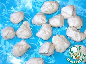 Переложите тесто на припыленную мукой поверхность стола и вымесите его несколько раз. Разделите тесто на 16 кусочков