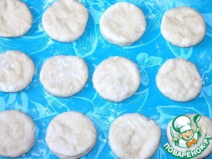 и раскатайте в лепешки размером с кофейное блюдце. Вырежьте кружочки Ф = 6 см.