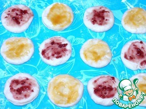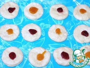 Я решила улучшить вкус и приукрасить булочки. Для этого взяла джем и положила по большой капле в середину каждого круга.
