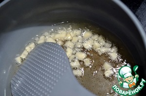 В большой сковороде на среднеv огне разогреть оливковое масло, добавить нарезанный чеснок и слегка обжарить несколько секунд.