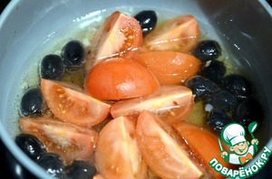 Добавить вино и выпарить в половину, примерно 2 минуты. Добавить разрезанные пополам или на 4 части томаты, бульон, маслины. Довести до кипения и готовить, изредка помешивая, до небольшого размягчения томатов, минут 8.