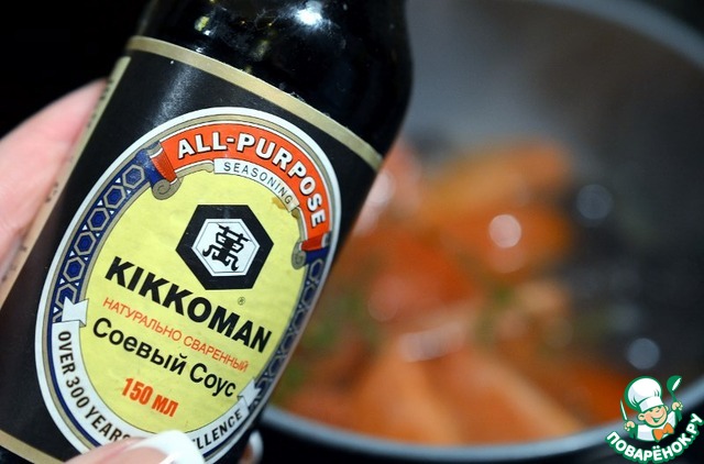 Добавить соевый соус Kikkoman. Накрыть крышкой и уменьшить огонь до минимума.