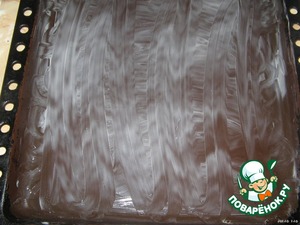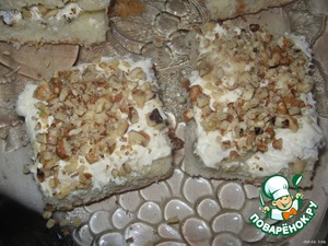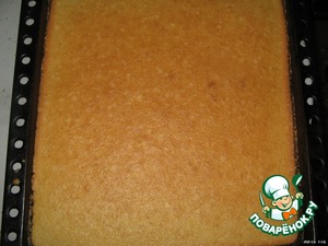 Даём остыть и нарезаем полученный корж на квадратики. Форма может быть совершенно любая. Можно сделать и в форме торта. Этого количества теста хватит на два коржа, которые лучше выпечь по очереди.