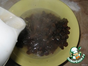 Изюм предварительно нужно залить кипятком и дать ему постоять минут 5.