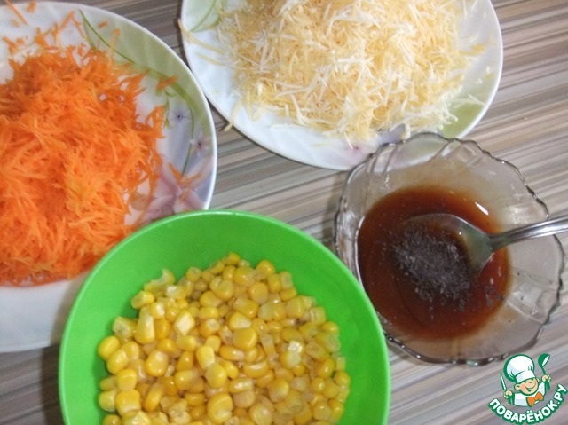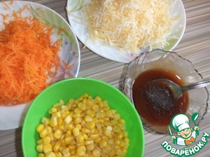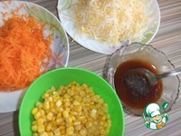 Для начинки морковь сырую и сыр нужно натереть на терке. Из кукурузы слить жидкость |