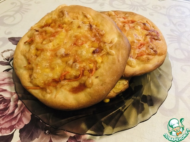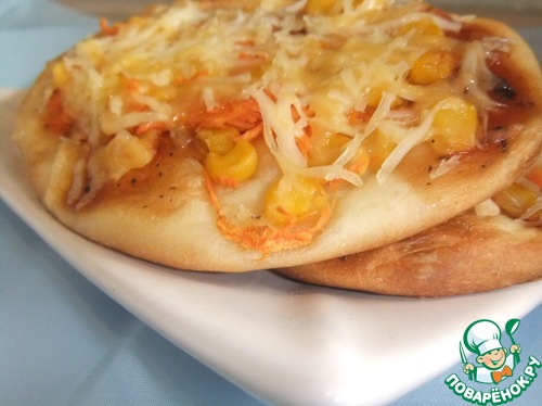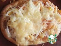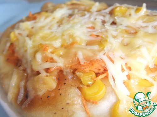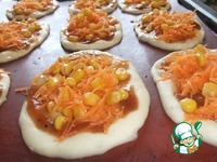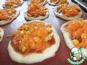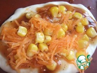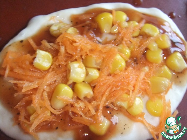 Смазываем соусом. Кладем сверху небольшое количество кукурузы и моркови |