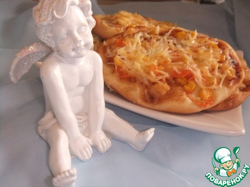 Через 10 минут достаем, посыпаем сыром и выпекаем до золотистого цвета. Тесто можно сделать и потолще, но нам нравится так - тонкая лепешка и хрустящие бока. |