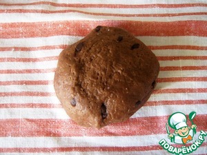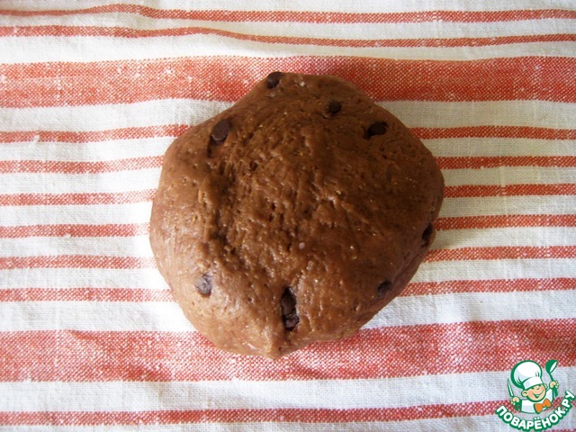 Шоколадное тесто. Смешать муку, соль, дрожжи, какао и залить всё это тёплым молоком с сахаром и маслом. Замесить тесто. Добавить шоколадные капли, перемешать, прикрыть, убрать в тёплое место.