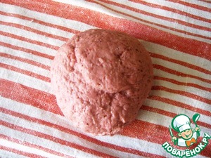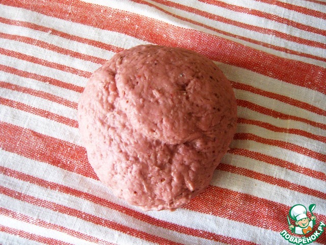 Клубничное тесто. Я использовала замороженную, её необходимо разморозить (до тёплого состояния) и перетереть в пюре. Вместо клубники можно также использовать варенье, тогда исключите из этого вида теста сахар. Муку, соль и дрожжи смешать. Соединить теплое клубничное пюре с сахаром с маслом и добавить к муке. Замесить тесто. Прикрыть и убрать на подъём в тёплое место.