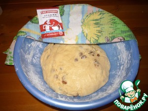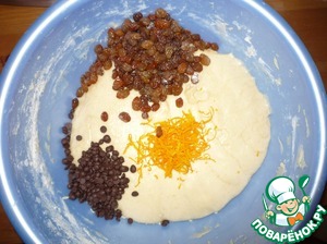 С апельсина снять цедру. По прошествии времени добавить наполнители - шоколадные капли (шоколада, наверное, можно и побольше), изюм, цедру.