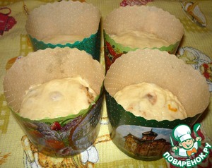 Раскладываем тесто по формам, у меня получилось 4 бумажные формы. Оставляем еще на часик на расстойку и после печем в разогретой духовке в течение часа на 160 градусах.