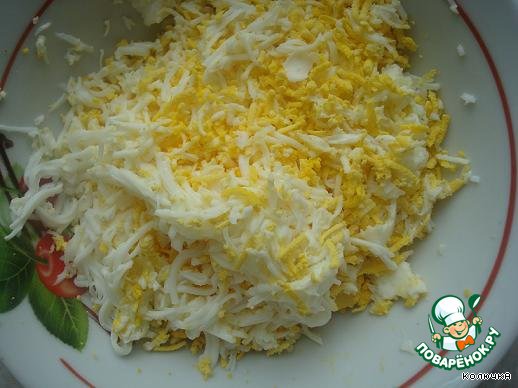 Добавляем тертый сыр, чеснок, майонез и перемешиваем.