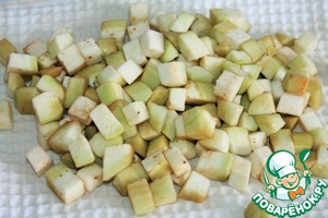 На сковороду наливаем оливковое масло и обжариваем баклажан на сильном огне, постоянно помешивая в течение 3 мин. Масла много не добавляем. На фото видно, что у меня практически сухая сковорода.