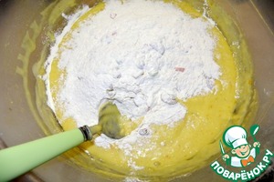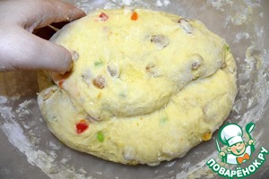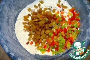 В оставшуюся муку всыпать предварительно промытый и обсушенный изюм. Можно половину заменить цукатами. Перемешать.