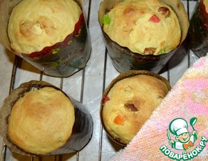 Подошедшее тесто еще раз вымесить на столе, разделить на кусочки и разложить по формочкам. Тесто должно заполнять 1/3 формы. Накрыть полотенцем и дать хорошо подняться.