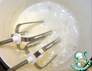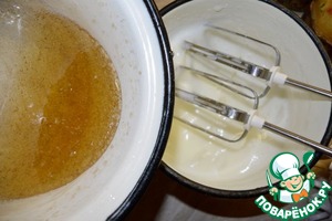 Не прекращая взбивания, вливать тонкой струйкой кипящий сироп. Взбить до крепких пиков, в конце добавить щепотку лимонной кислоты.