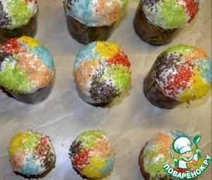 Обмазать куличи глазурью и посыпать присыпкой или крашеным сахаром. Я еще сверху украсила цветочками из сахарной мастики.
