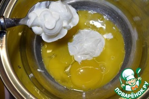 Отделить белки от желтков, белки оставить для глазури, а желтки смешать с солью, сахаром и сметаной.