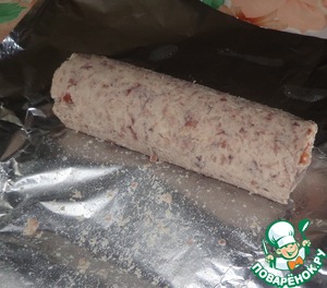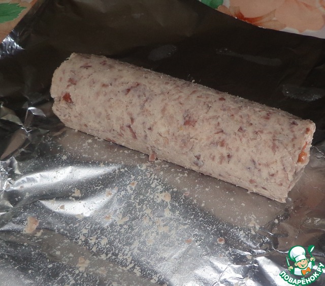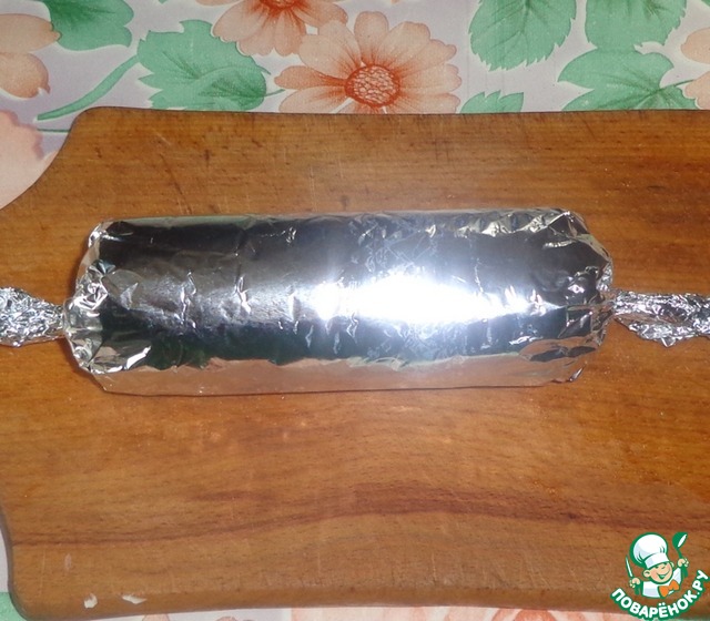 Заворачиваем его в фольгу и отправляем в холодильник на 2-3 часа. Затем убираем фольгу и нарезаем рулет на кусочки.