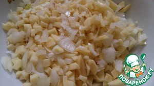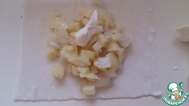 Для начинки картофель и лук очистить, помыть. Нарезать мелкими кубиками. (По желанию, можно добавить в начинку зелень) Посолить, поперчить. Важный момент! Солить начинку нужно в последнюю очередь, иначе картофель пустит сок, и тесто станет влажным!